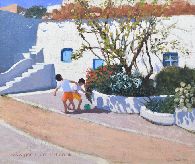 Andrew Macara (English, born 1944) 'Lilies and Geraniums, Santorini', signed and dated 2002, (titled on label verso), oil on canvas, 49.5 cm x 59.5 cm. © The Artist, *(Image credit and thanks to Willson55 (Peter Wilson Fine Art Auctioneers Ltd) for their photograph of the painting).